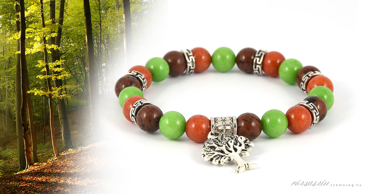 8 mm-es Mahagóni Obszidián, narancs és zöld színű Jade ásványgyöngyökkel, fém köztessel, életfa medállal