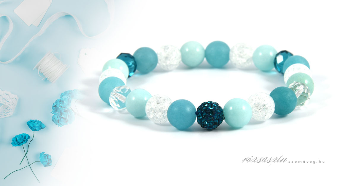 Álomkék ásvány karkötő, a következő ásványokat tartalmazza: Jade, Hegyikristály.
