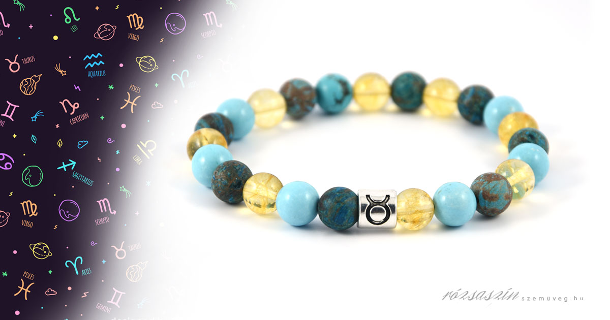 8mm-es Citrin, Krizokolla, Türkiz ásványokból, fém horoszkóp köztessel
