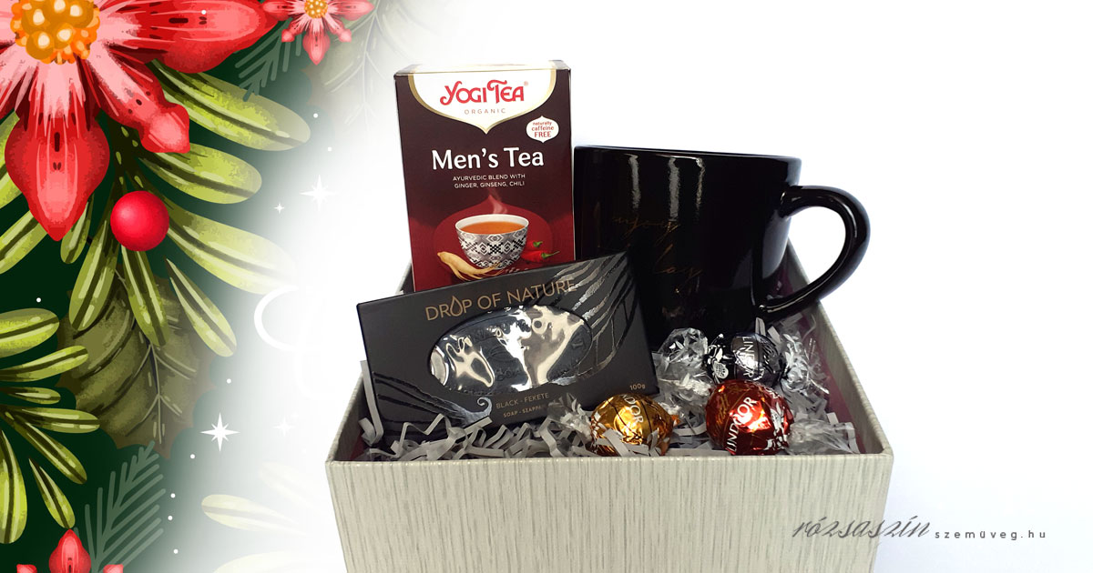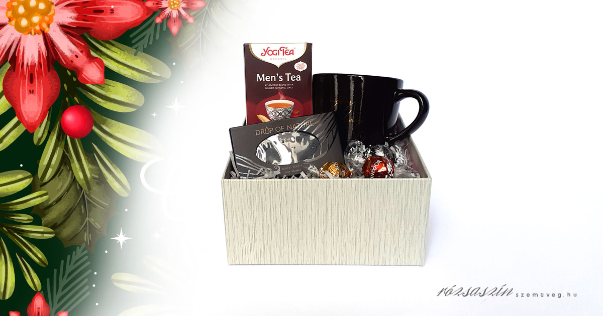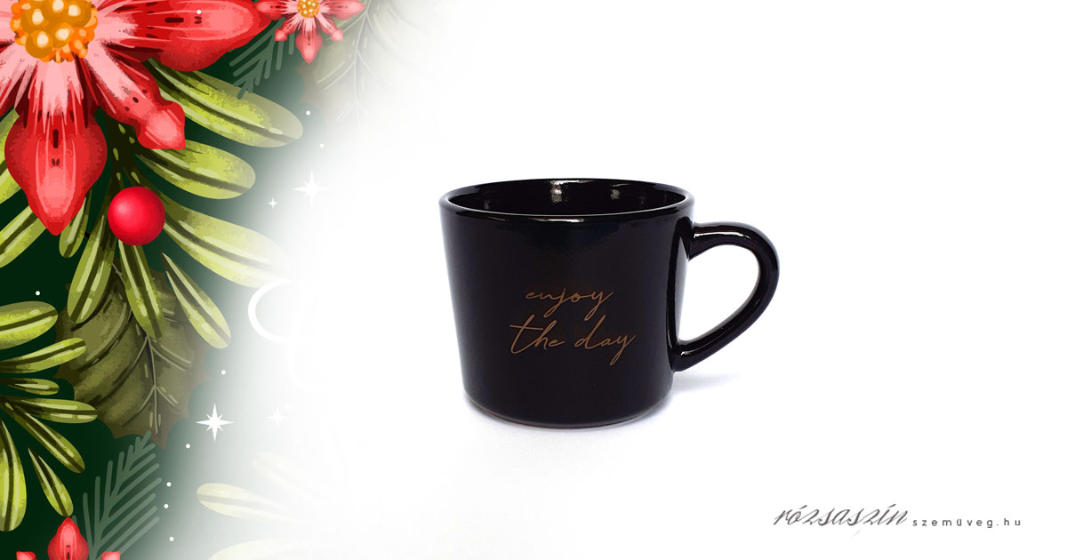 Erős, édes, fűszeres. A doboz 17 teafüvet tartalmaz. - Fekete színű porcelán bögre, „Élvezd a napot” arany felirattal, űrtartalom 400 ml