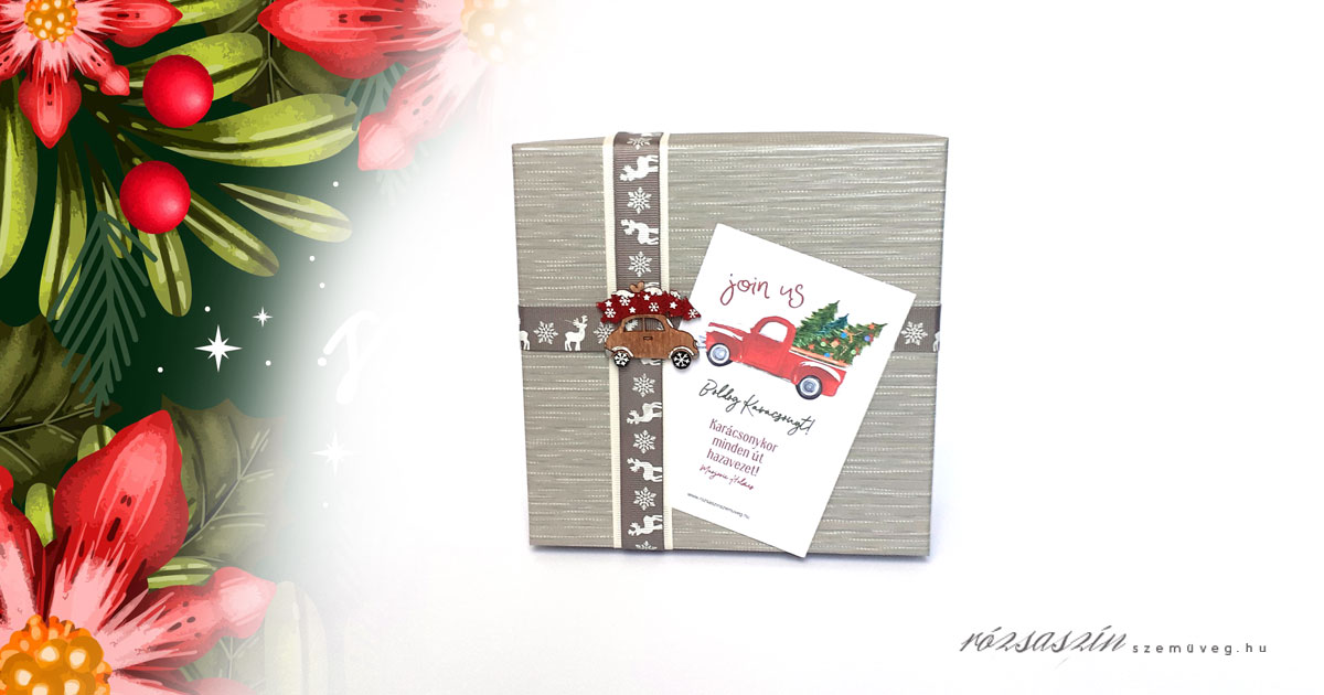 - szalaggal és fa dekorációval díszített ajándék doboz