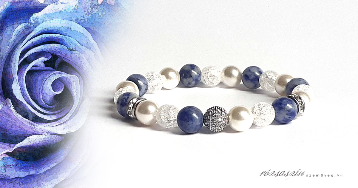 Festői harmónia ásványkarkötő a következő ásványokat tartalmazza, Szodalit, Hegyikristály, Kagylógyöngy.