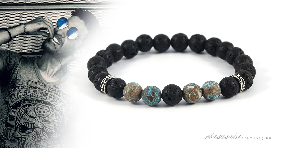 8 mm-es, Krizokolla, Lávakő ásványgyöngyökkel, fém köztessel.
