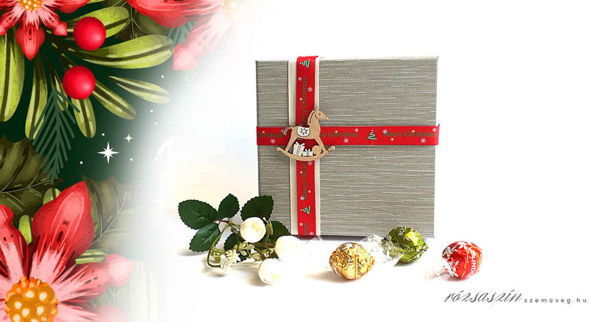 • 1 db szalagokkal, fa hintalóval díszített, szürke színű, díszdoboz
