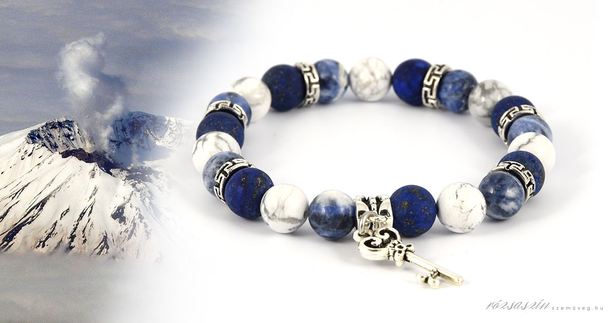 8 mm-es Szodali, Lapis lazuli, Howlit, ásványgyöngyökkel, fém köztessel, kulcs medállal