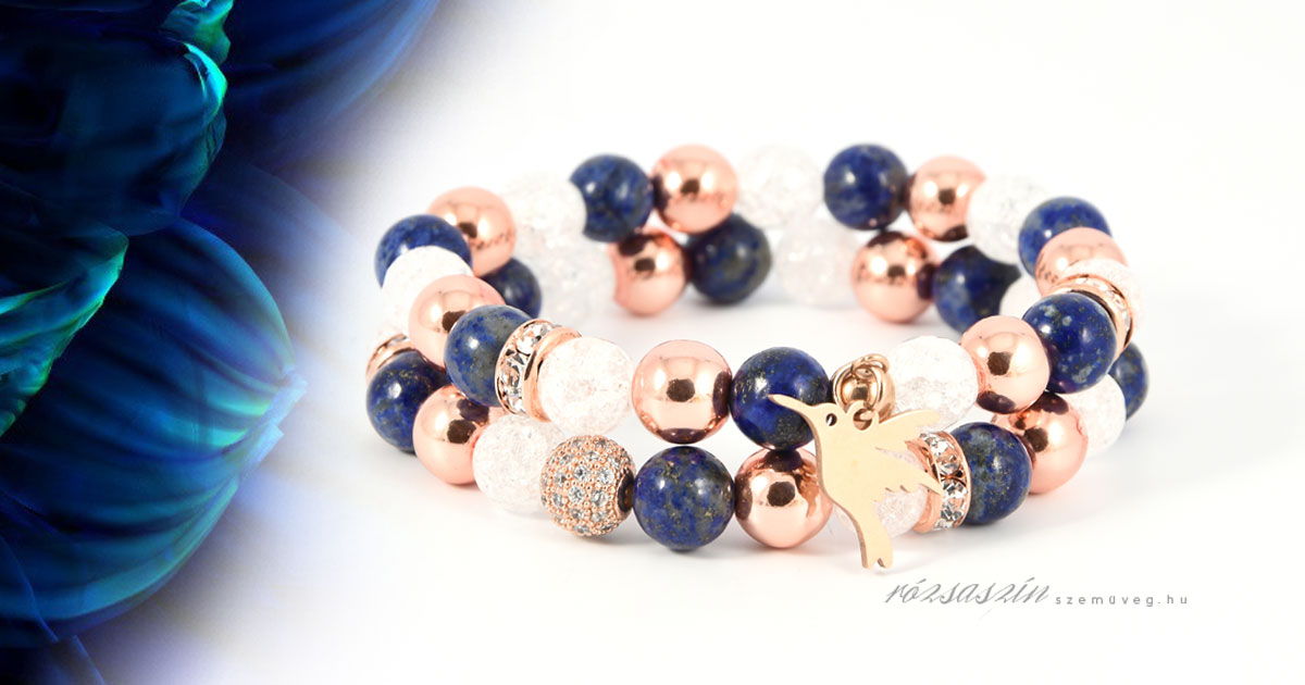 Mámor kék elegancia ásvány karkötő szett, a következő ásványokat tartalmazza: Lapis lazuli, Hematit, Hegyikristály.