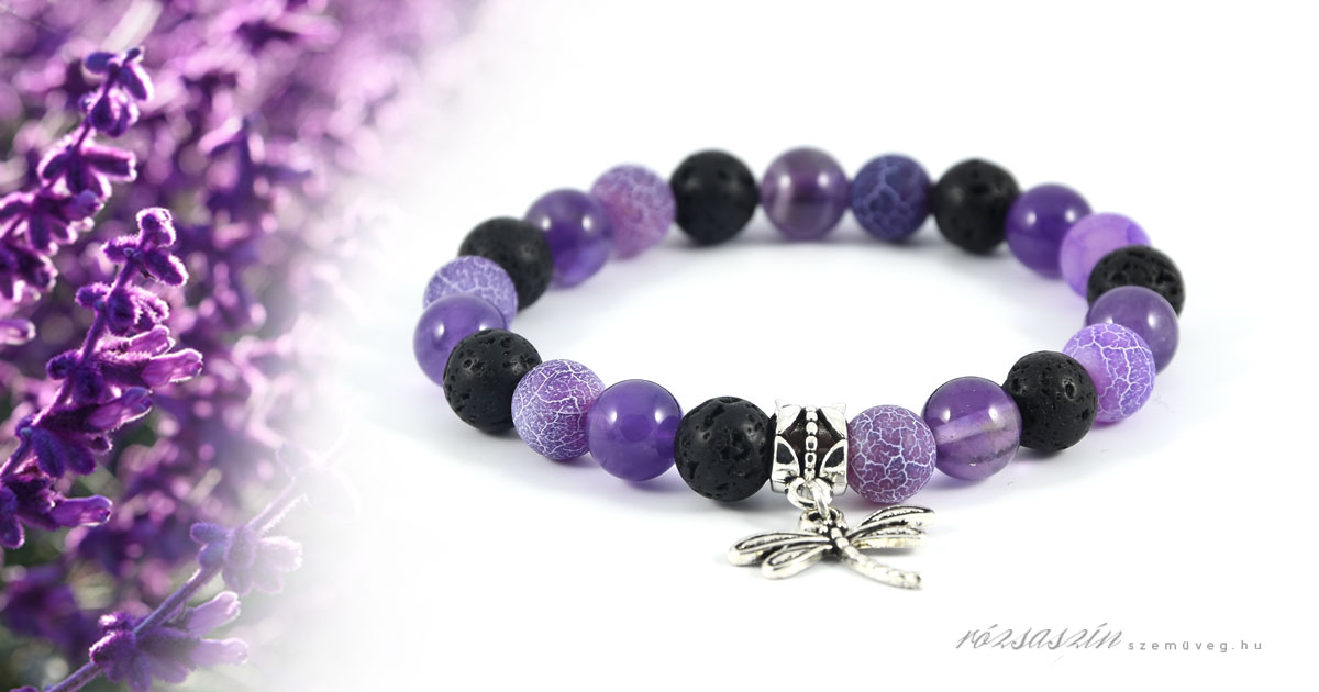 Nyugodt pillanatok ásvány karkötő, a következő ásványokat tartalmazza, Ametiszt, Frozen Achát, Lávakő