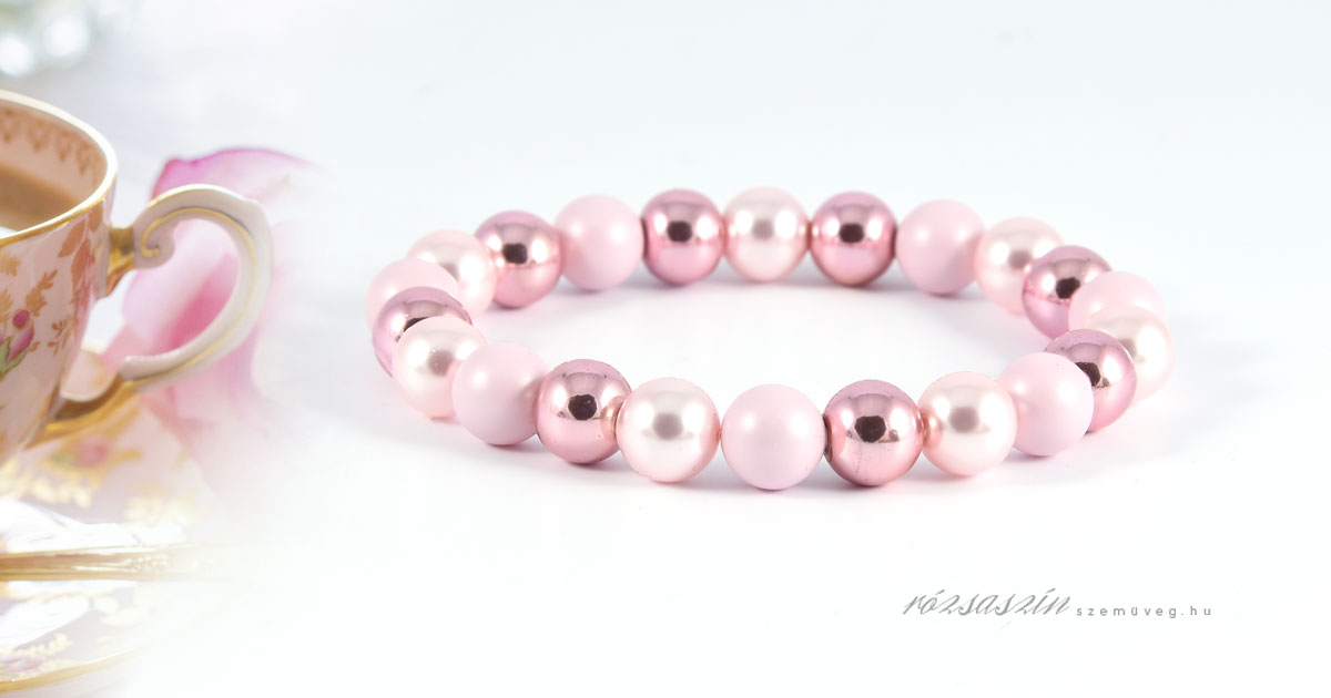 8 mm-es pink Kagylógyöngy, rózsaszín gyöngyházfényű és matt pasztell rózsaszín Swarovski kristálygyöngy.