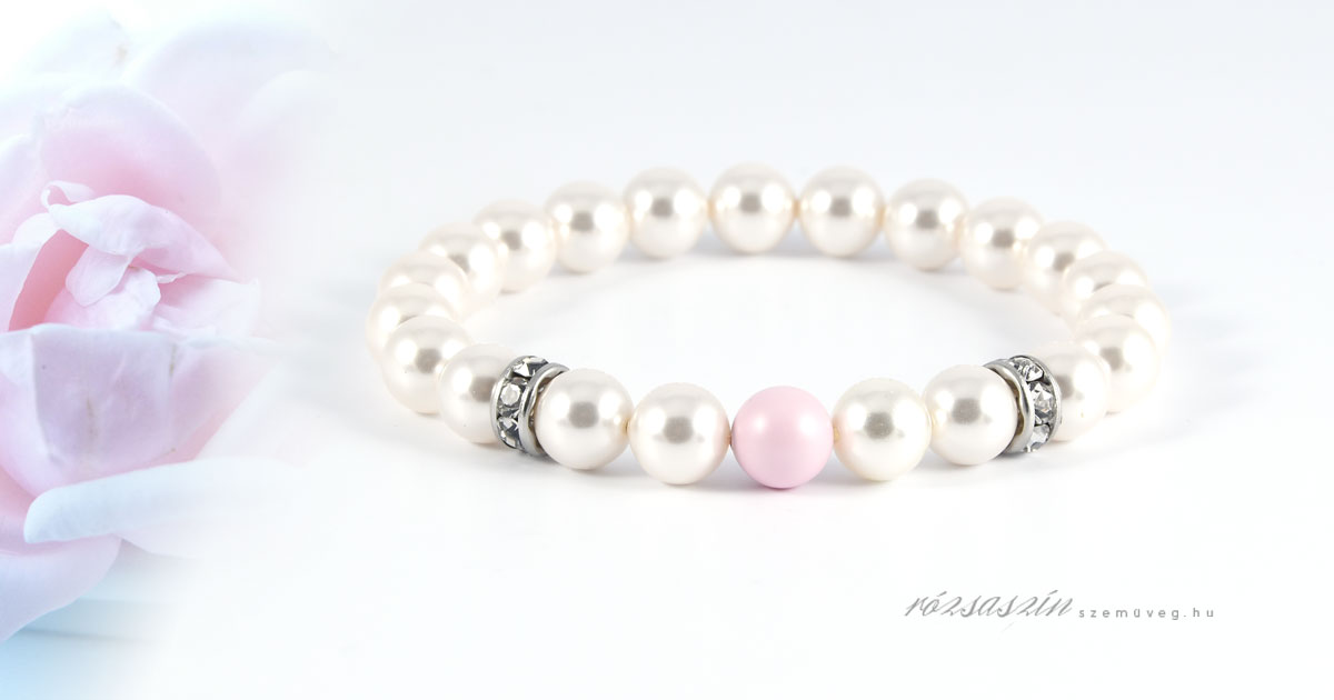 Pasztell rózsaszín álmok nemesacél ásvány karkötő, a következő ásványokat tartalmazza, kagylógyöngy ( shell pearl ) és Preciosa pasztell rózsaszín kristálygyöngy.