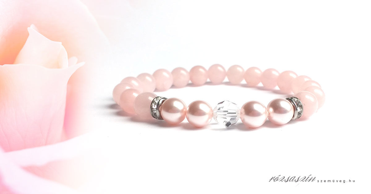 8 mm-es Rózsakvarc ásványgyöngy, 8 mm rózsaszín Sw@rovski kristálygyöngy, átlátszó csiszolt Sw@rovski kristály, nemesacél strasszos köztes.