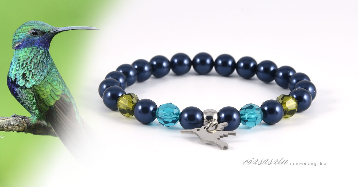 8 mm-es sötétkék, (night blue) gyöngyházfényű Swarovski kristálygyöngy, olajzöld és türkizkék csiszolt Swarovski kristály.