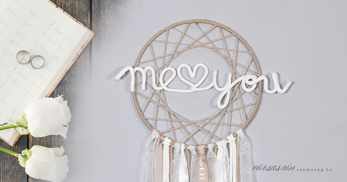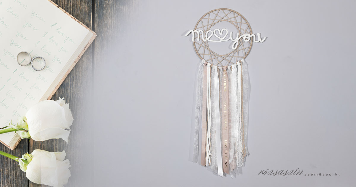Szerelmi egység álomfogó, szatén, csipke, feliratos szalagokkal, selyem virágfejjel, me & you ( te és én ) felirattal.