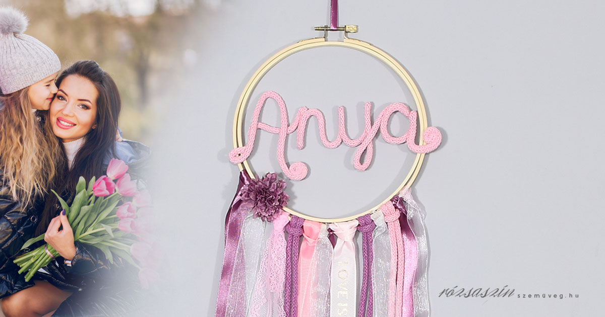 Szeretlek anya álomfogó, bambusz kereten, szatén, csipke, feliratos szalagokkal, pamut zsinórral, selyem virágfejjel, Anya felirattal.