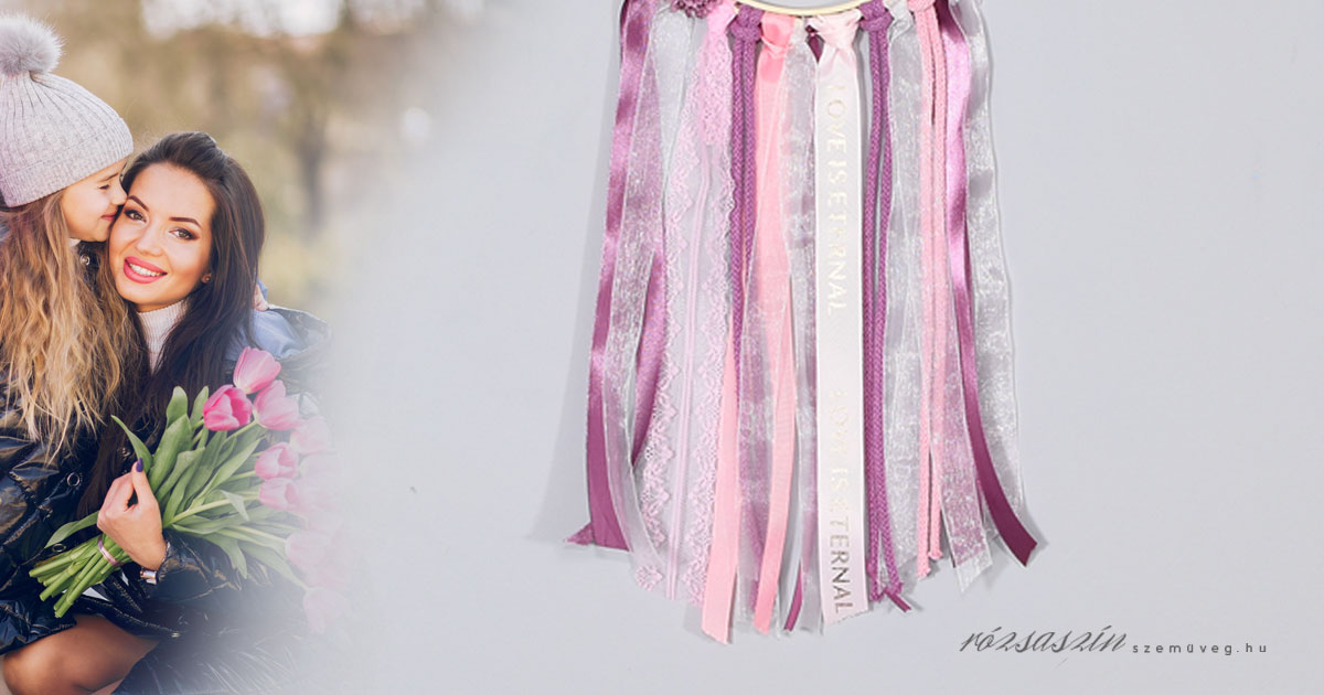 A szeretlek anya álomfogó teljes hossza szalagokkal 55 cm + 5 cm a felakasztó szatén szalag.