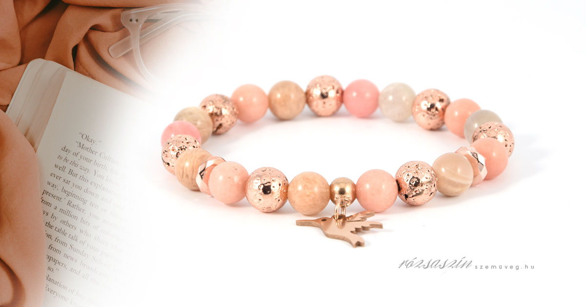 Varázslatos világ nemesacél ásványkarkötő, a következő ásványokat tartalmazza: Holdkő, Jade, Lávakő, Hematit.